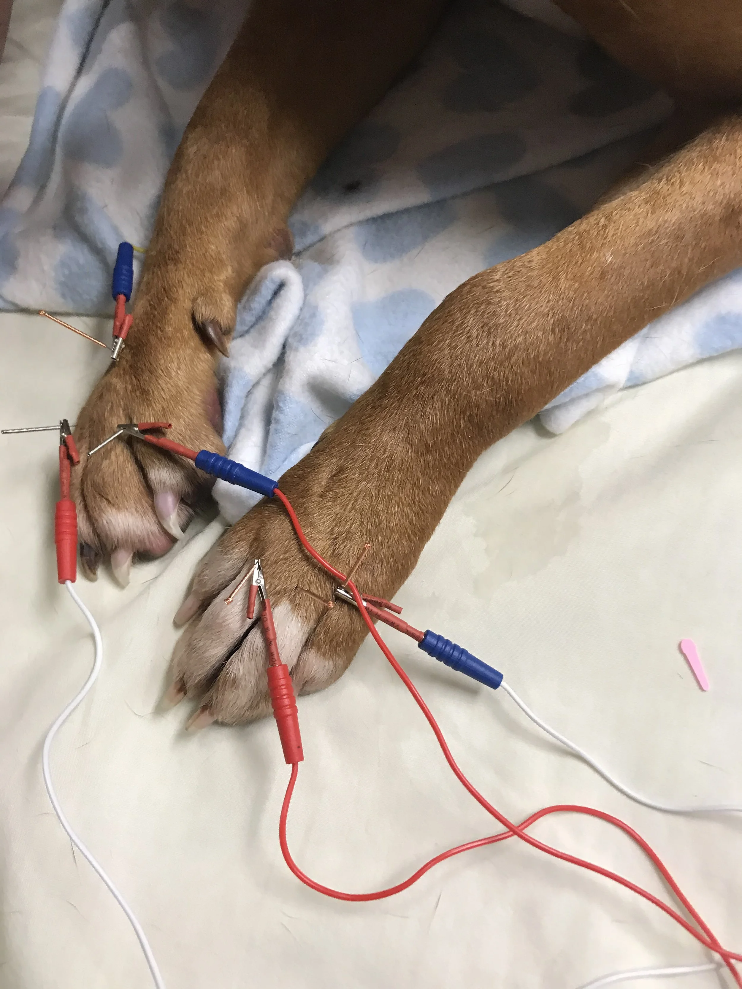 Acupuncture is most often performed with sterilized solid, not hollow, needles that are very small. There is sometimes a brief moment of sensitivity, tingling or pressure as the needle penetrates the skin and the acupuncture point is stimulated. This method of acupuncture is called dry needling. Once the needles are in place, most animals relax due to endorphin release and other healing effect. It is fairly common for patients to fall asleep during treatment. They also may feel a “zing” after needles are places which is a good thing as the point and Qi are being stimulated.